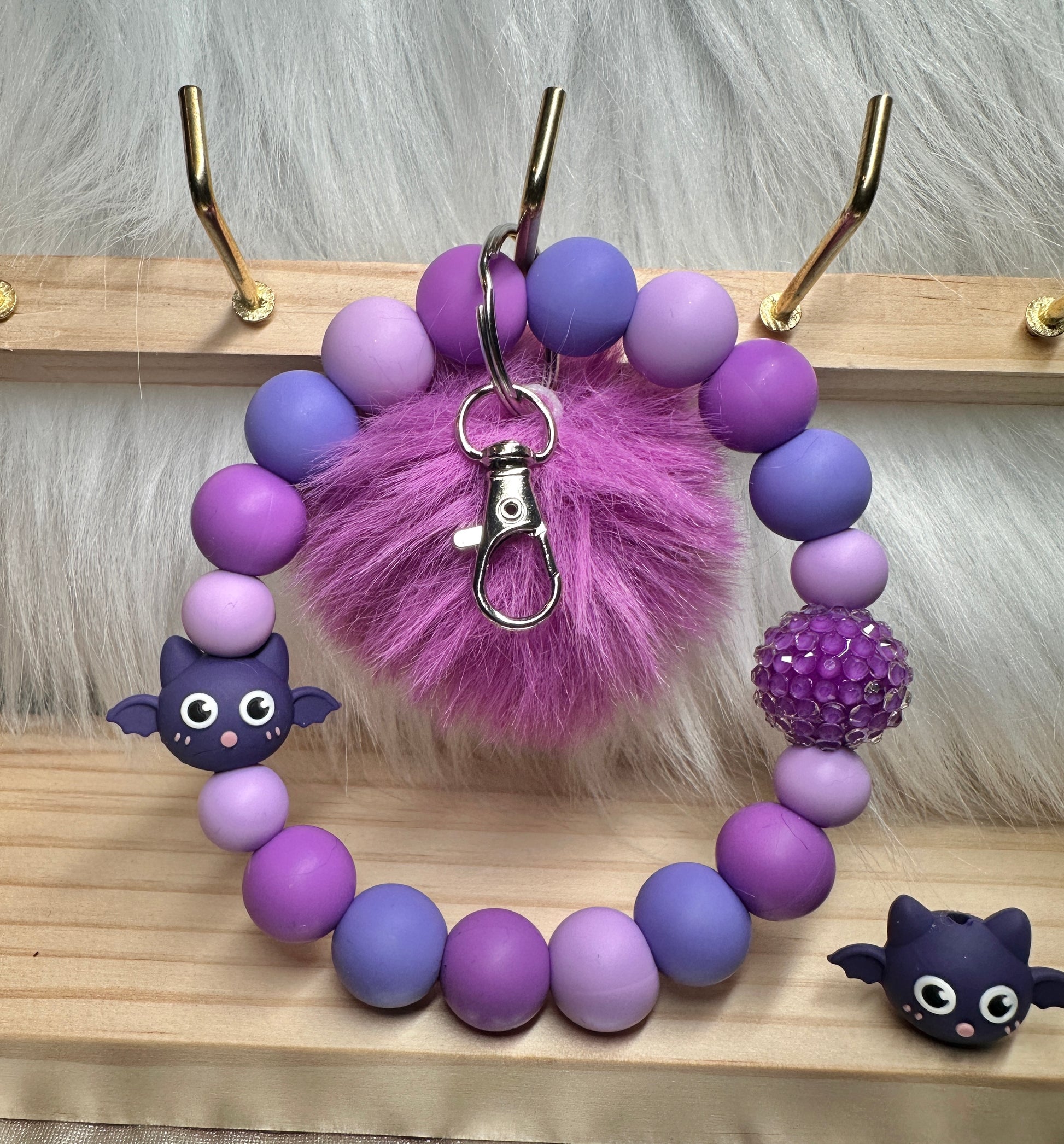 Wristlet Keychain w/Pom Pom Bat Focal and Eggplant purple accent rhinestone bead.