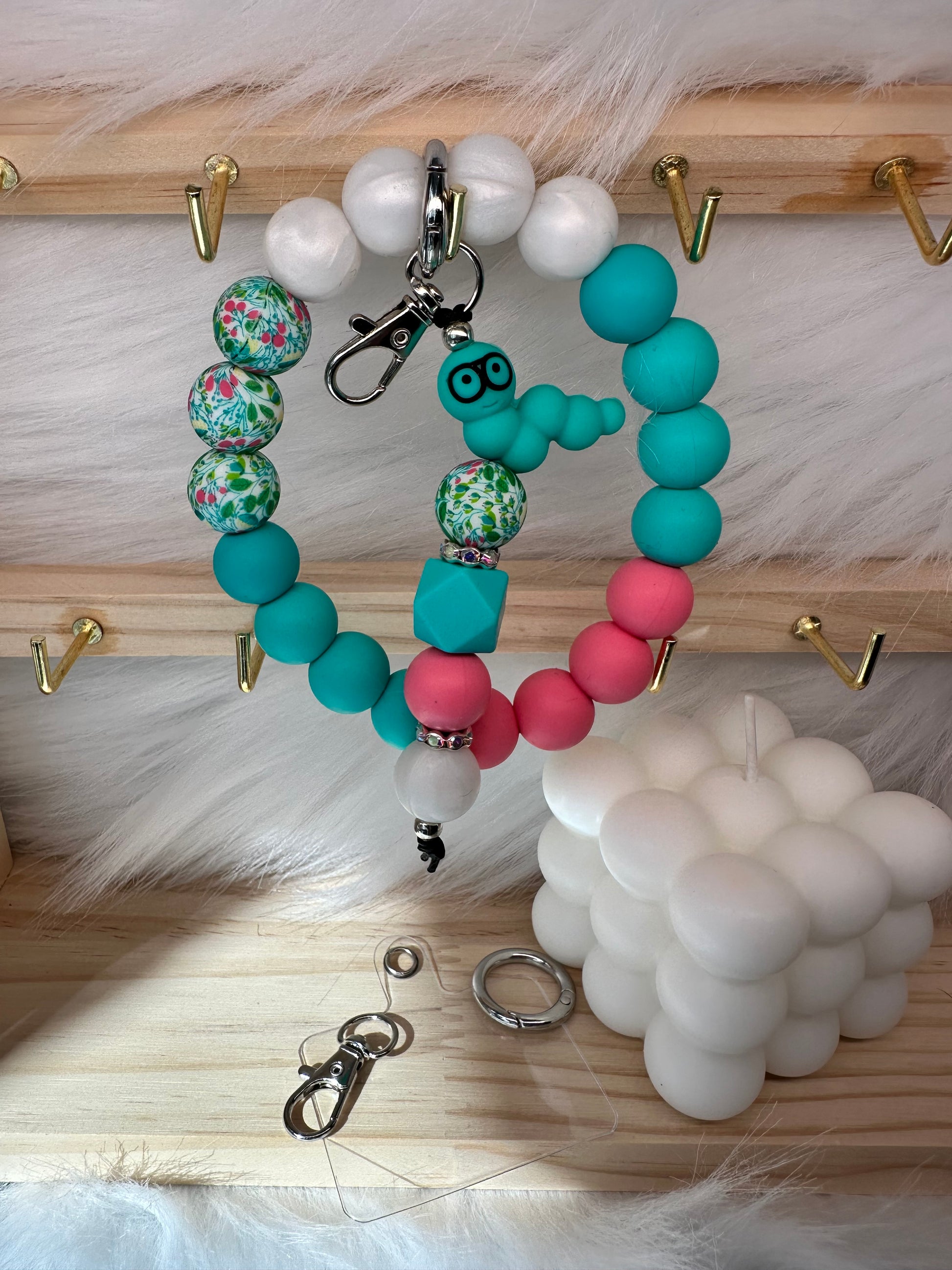 Mobile phone accessory wristlet and keychain charm. This multi-functional accessory comes complete with one (1) wristlet, one (1) keychain/charm, and one (1) clear tether tab for your mobile phone. Handcrafted in Penny's House.