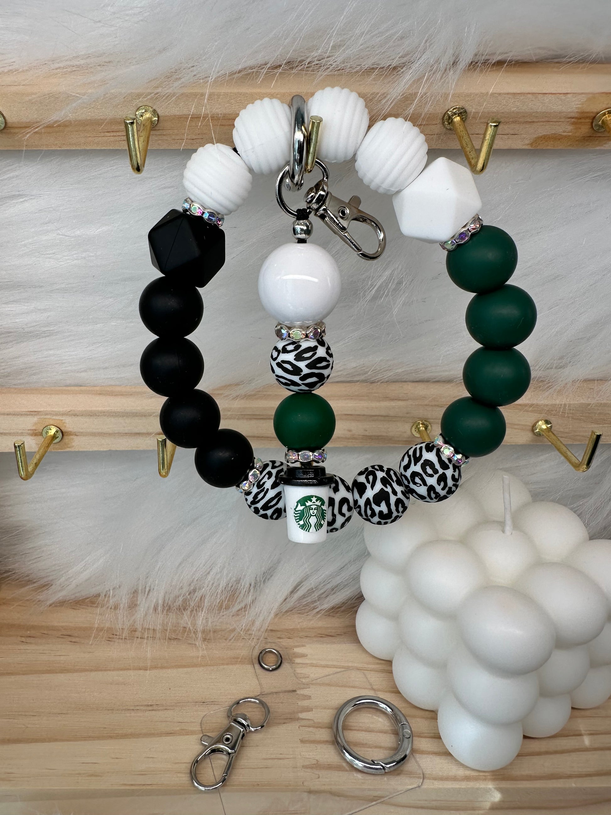 Mobile phone accessory wristlet and keychain charm. This multi-functional accessory comes complete with one (1) wristlet, one (1) keychain/charm, and one (1) clear tether tab for your mobile phone. Handcrafted in Penny's House.