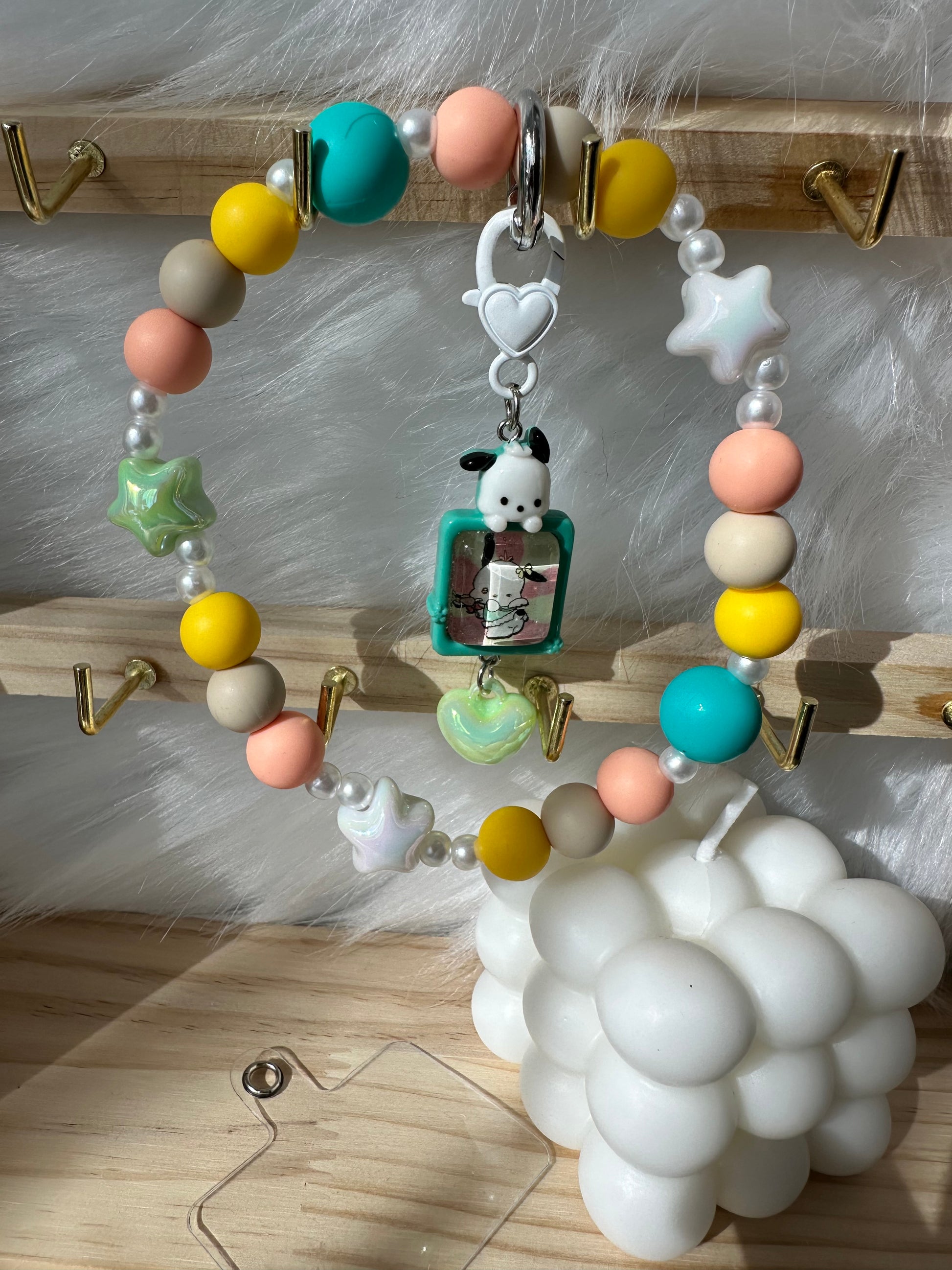 Mobile phone accessory wristlet and keychain charm. This multi-functional accessory comes complete with one (1) wristlet, one (1) keychain/charm, and one (1) clear tether tab for your mobile phone. Handcrafted in Penny's House.