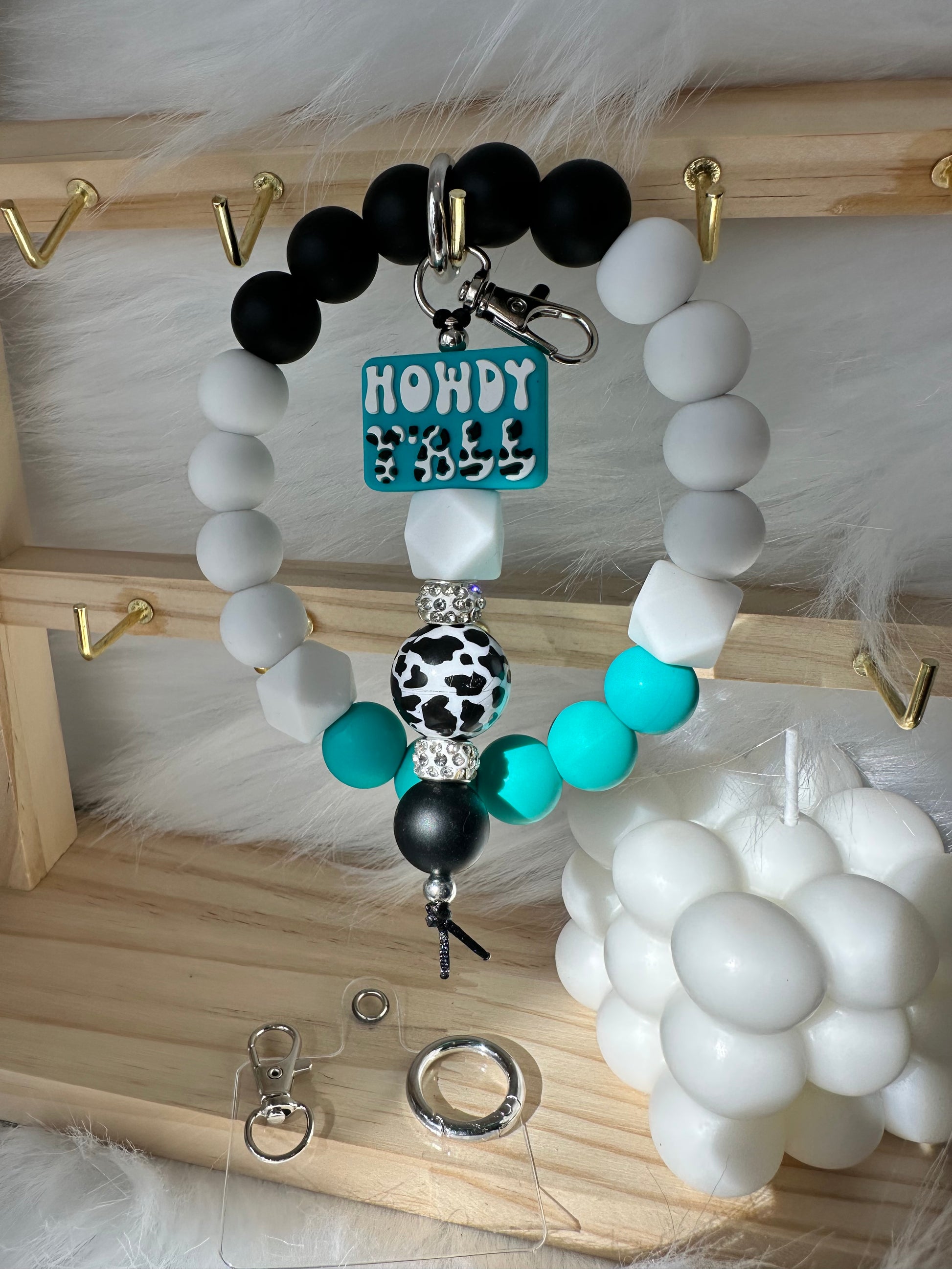 Mobile phone accessory wristlet and keychain charm. This multi-functional accessory comes complete with one (1) wristlet, one (1) keychain/charm, and one (1) clear tether tab for your mobile phone. Handcrafted in Penny's House.