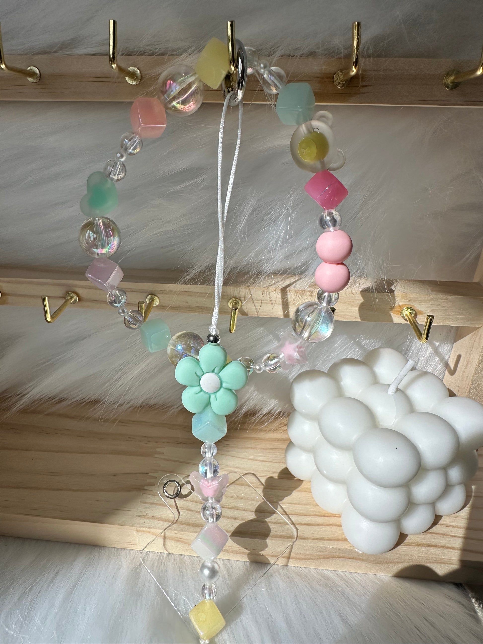 Mobile phone accessory wristlet and phone chain. This multi-functional accessory comes complete with one (1) wristlet, one (1) phone chain, and one (1) clear tether tab for your mobile phone. Handcrafted in Penny's House.