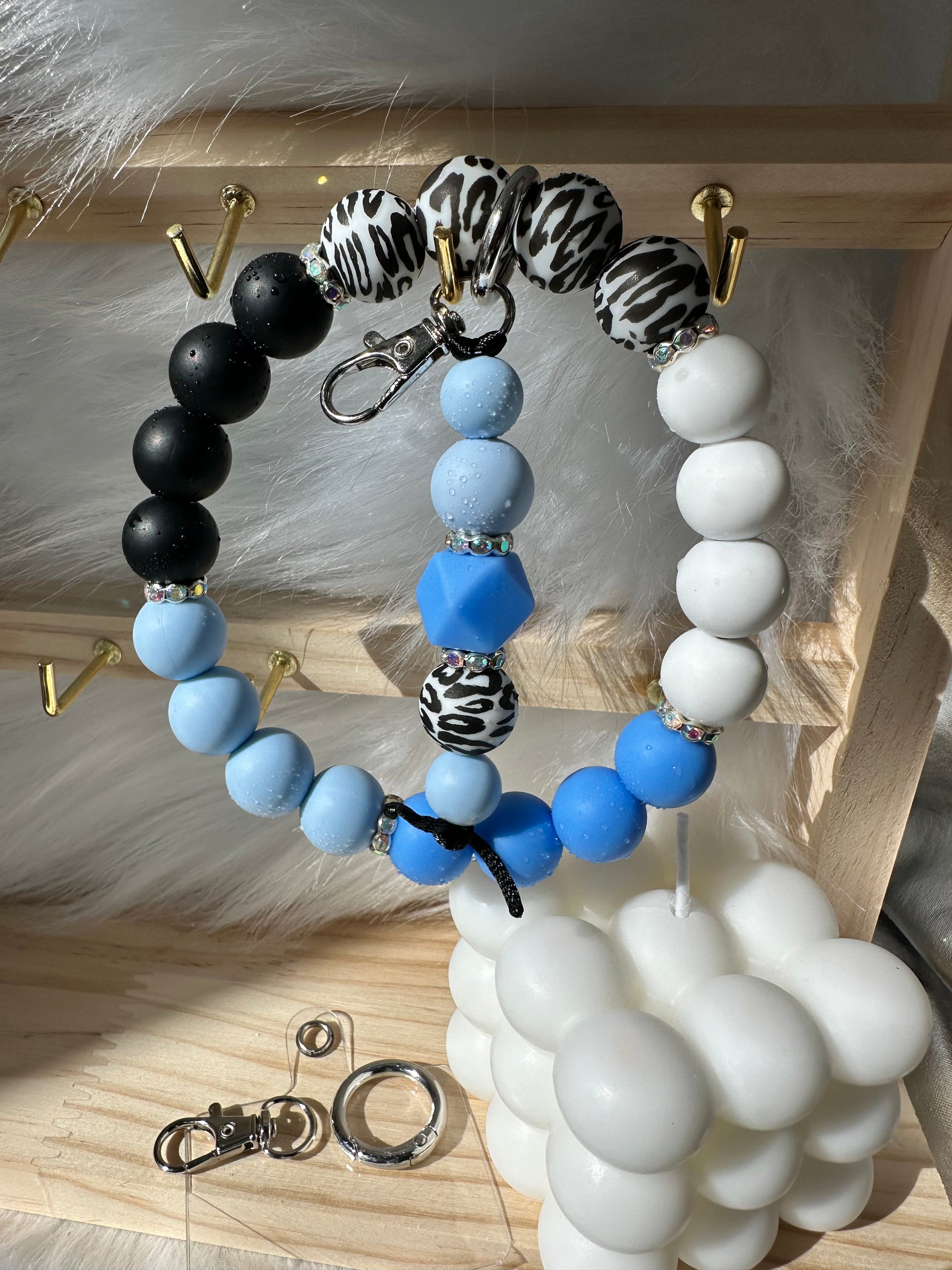 Mobile phone accessory wristlet and keychain charm. This multi-functional accessory comes complete with one (1) wristlet, one (1) keychain/charm, and one (1) clear tether tab for your mobile phone. Handcrafted in Penny's House.